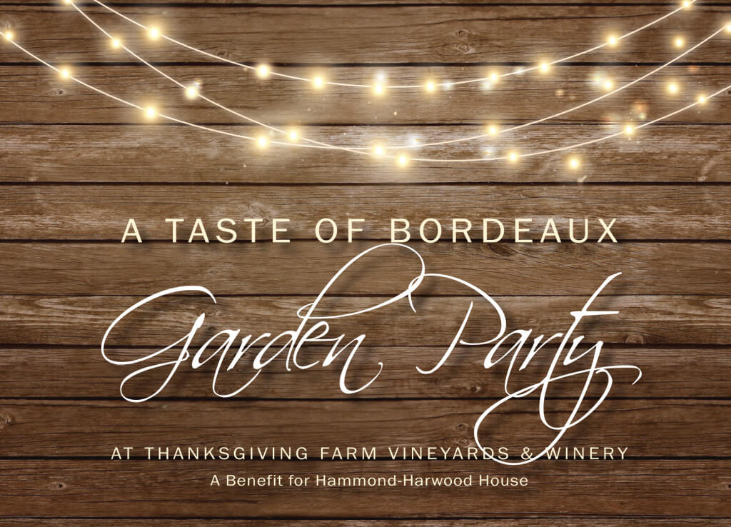This summer’s Garden Party to benefit the Hammond-Harwood House will be held at Thanksgiving Farm Vineyards & Winery in beautiful South County. Set amid rolling hills and surrounded by centuries-old farms, the winery features a charming 1893 farmhouse and acres of vineyards. The property is on the National Register of Historic Places. Bordeaux-style estate wines are produced on site.