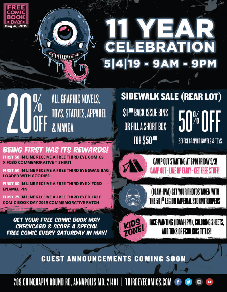 Free Comic Book Day at Third Eye Comics Annapolis: Join us for our annual free Comic Book Day + 11 years of Third Eye Comics. Choose from more than 30 free comics plus other free swag, creator guests, super sales and more.